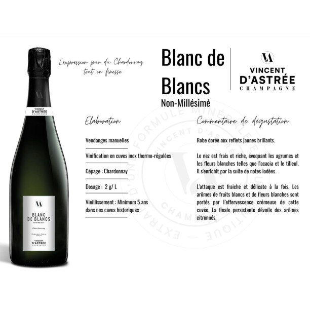 L'attaque est fraiche et délicate à la fois. Les arômes de fruits blancs et de fleurs blanches sont portés par l’effervescence crémeuse de cette cuvée. La finale persistante dévoile des arômes citronnés.